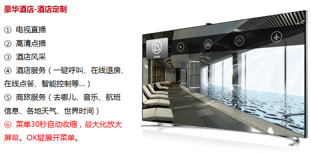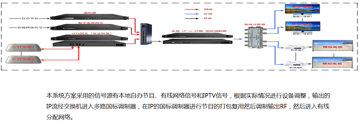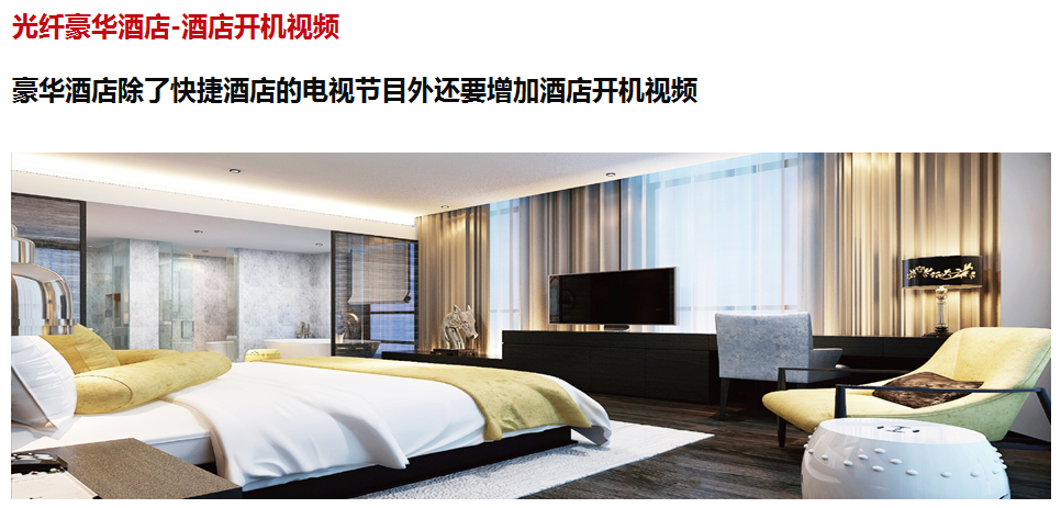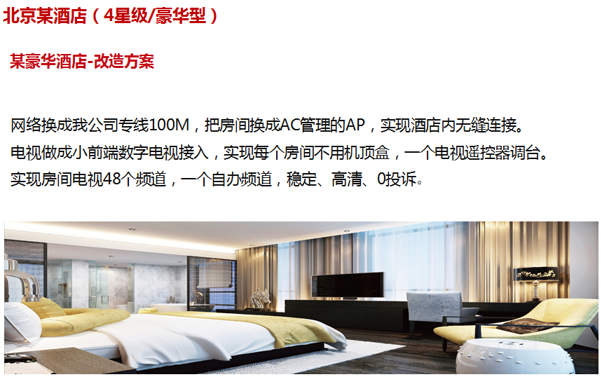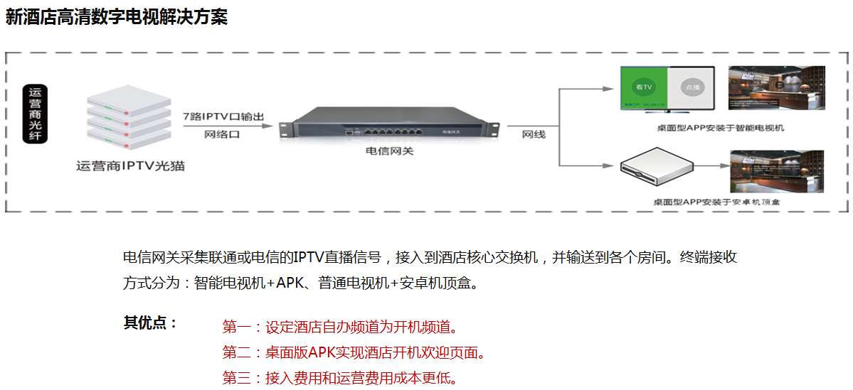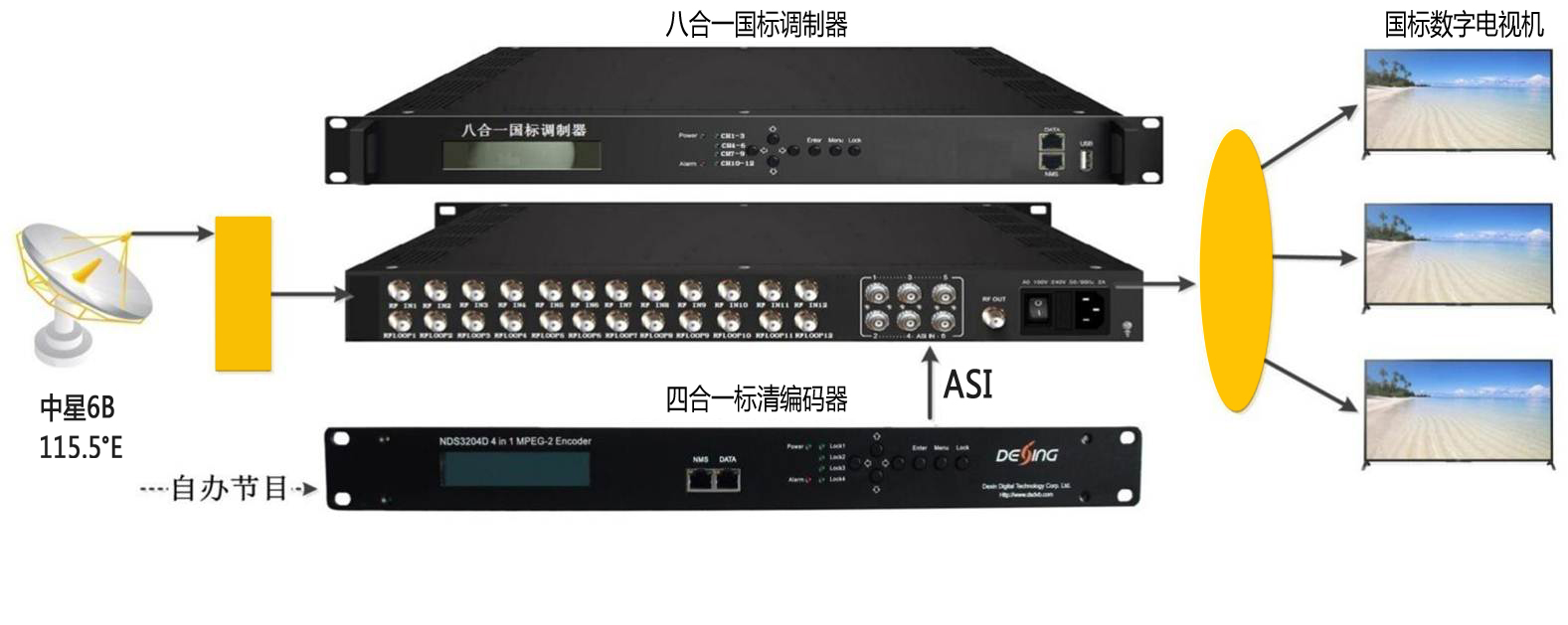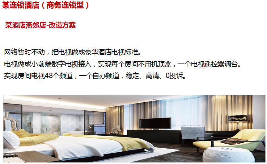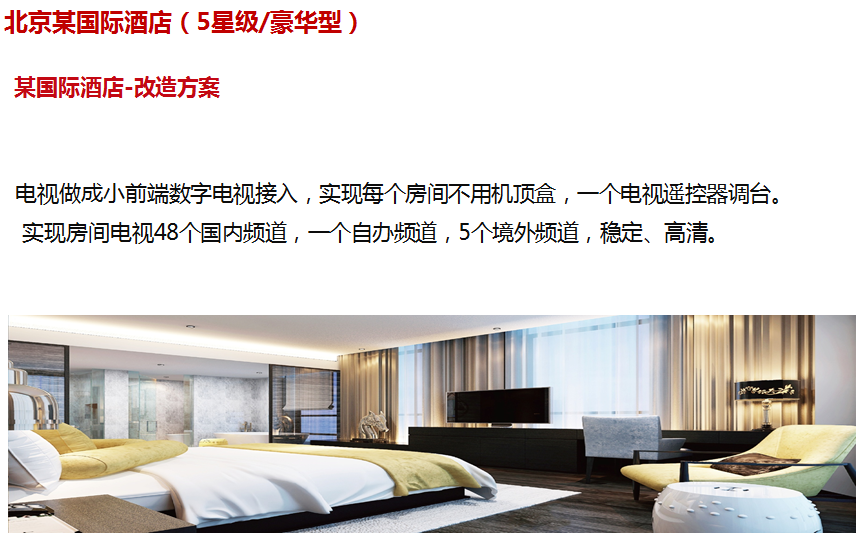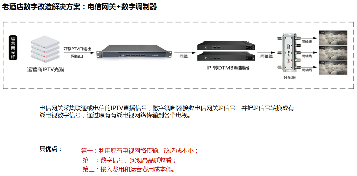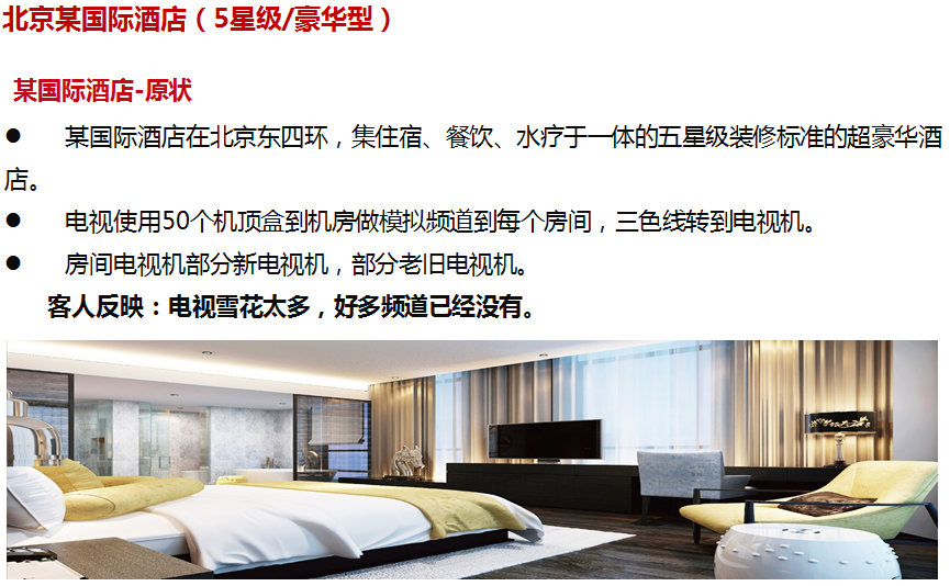 酒店现状一:设备支持12路Tuner接收,6路ASI输入,8路国标调制 载波输出,是小酒店宾馆建设首选。使用一台四合一编码器对自办节目进行编码传输,极大的降低了建设成本。 许多酒店电视采用的都是模拟系统,节目有限,常常出现雪花、网纹、 图像跳动等干扰情况,给客人留下不好的印象。