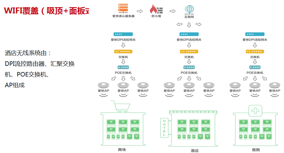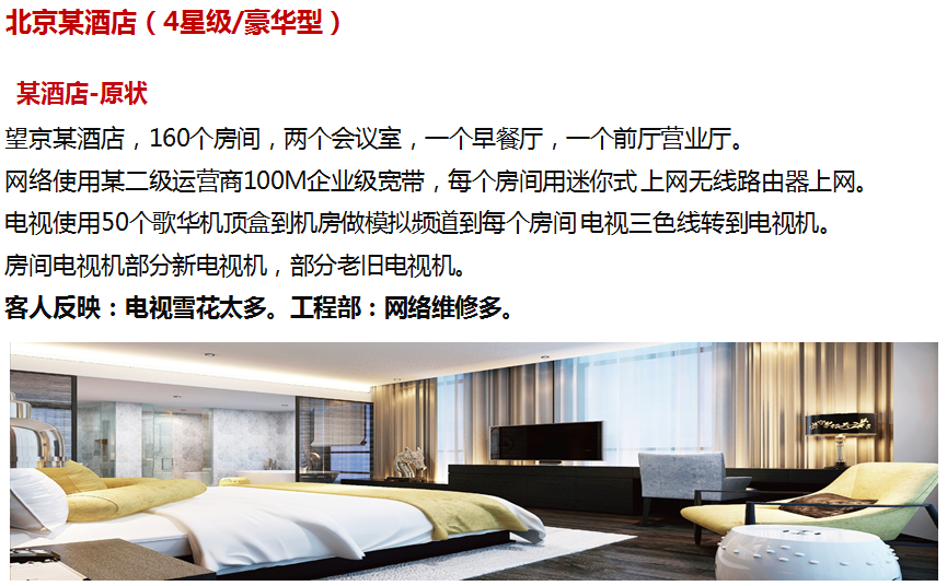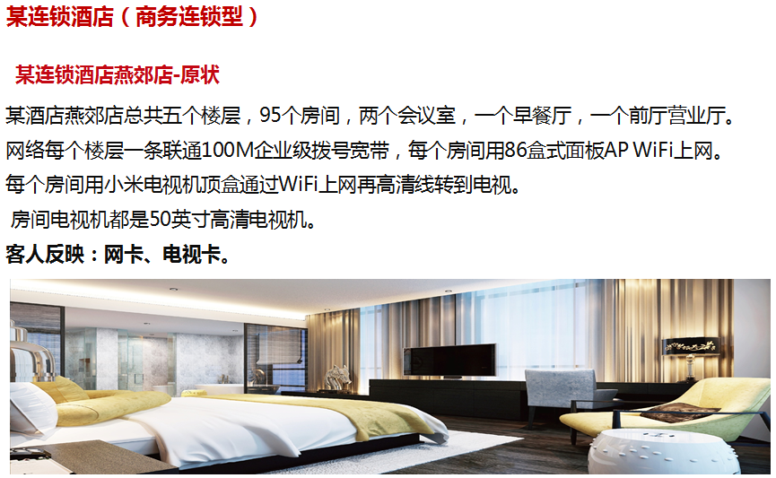 酒店现状二: 许多酒店的网络WIFI系统没有AC管理,AP掉线也不能及时发现管理。更有的酒店使用的互联网出口为汇聚带宽。这些都会导致客户网络体验差。